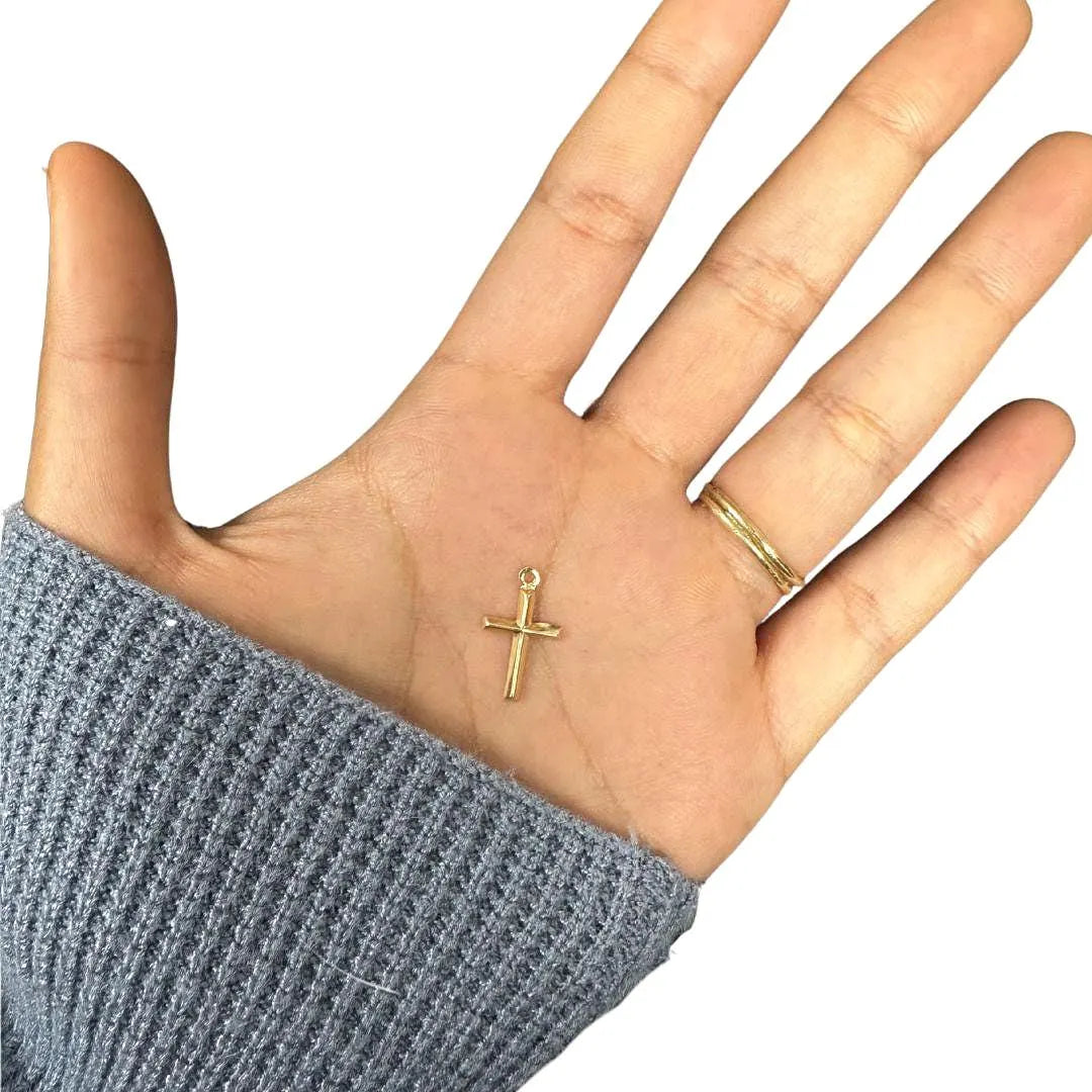 Genuine 14kt Gold14kt Puffed Cross CharmHigh Polished Stamped & Lightweight CharmMeasurements: 10mm x 17mm CharmOpen Eye at Top To Easily Attach A Jump Ring or Bail