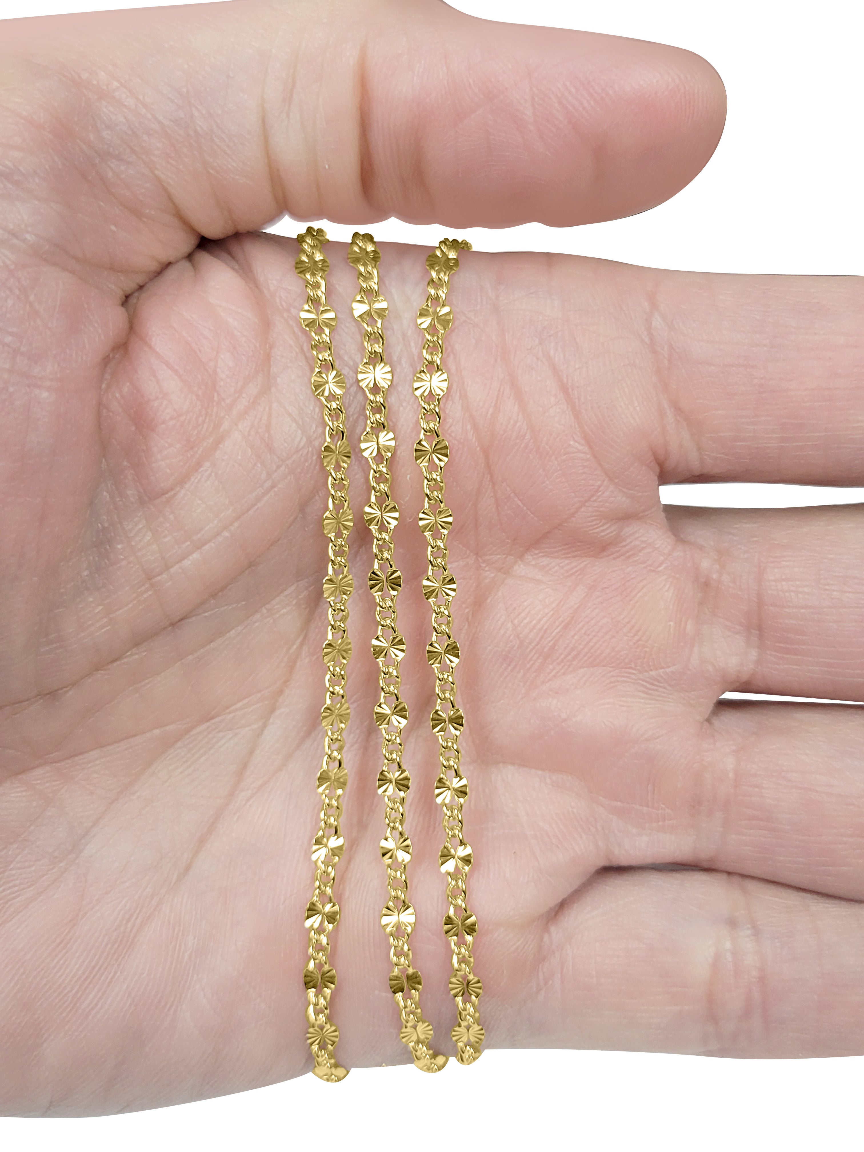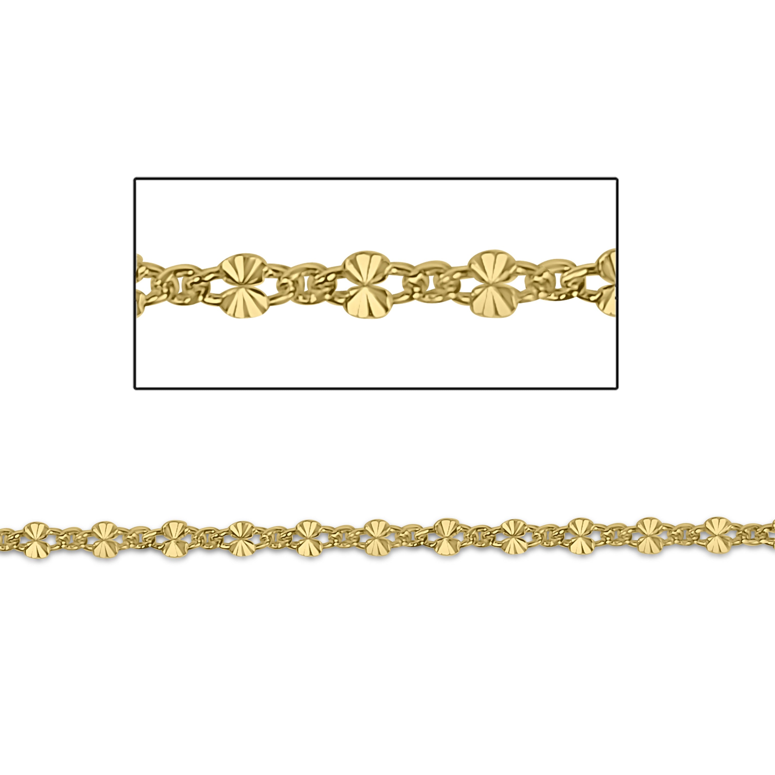 Genuine 14kt Gold filled Starburst Link Chain. Completely machine run and soldered links. 3mm x 5mm with 3 small cable links in between each. Made from 22 gauge wire. Sturdy chain. Great for all jewelry applications. Unisex Chain.