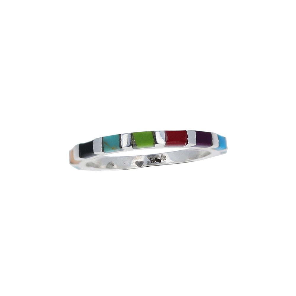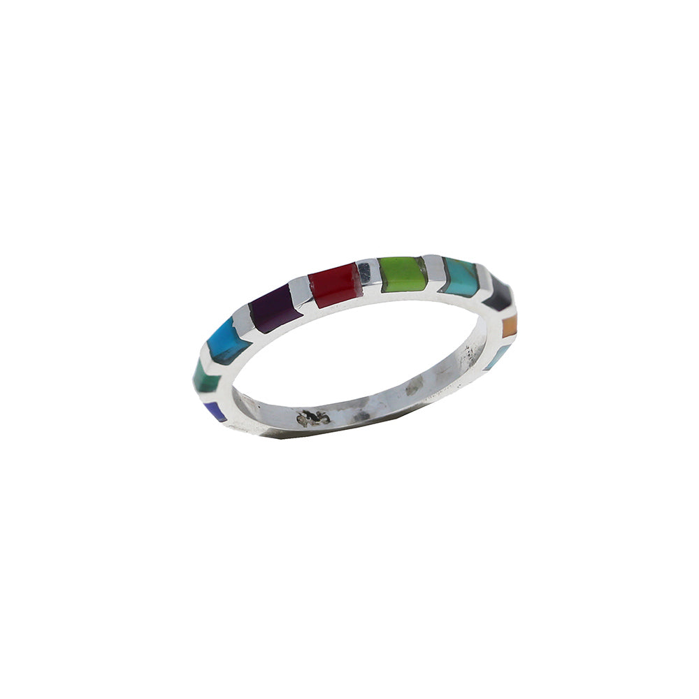 Inlaid natural stones. Colors go 3/4 around and taper to a simple silver band.