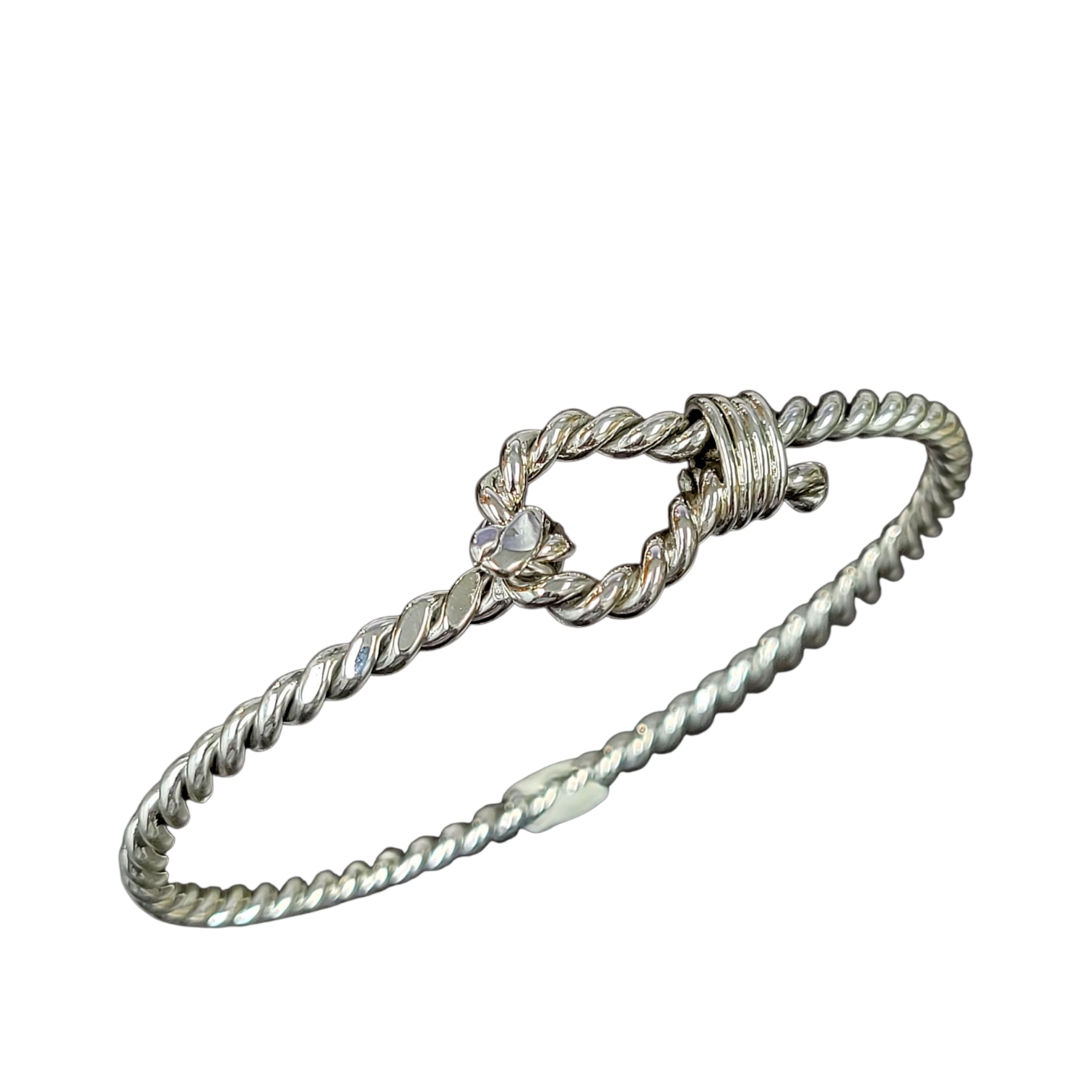 .925 Sterling SilverAntiqued Braided Silver. 3.5mm ThickHand woven Oval Design. Hook Clasp.Add a charm to the attachment center or wear by itself.