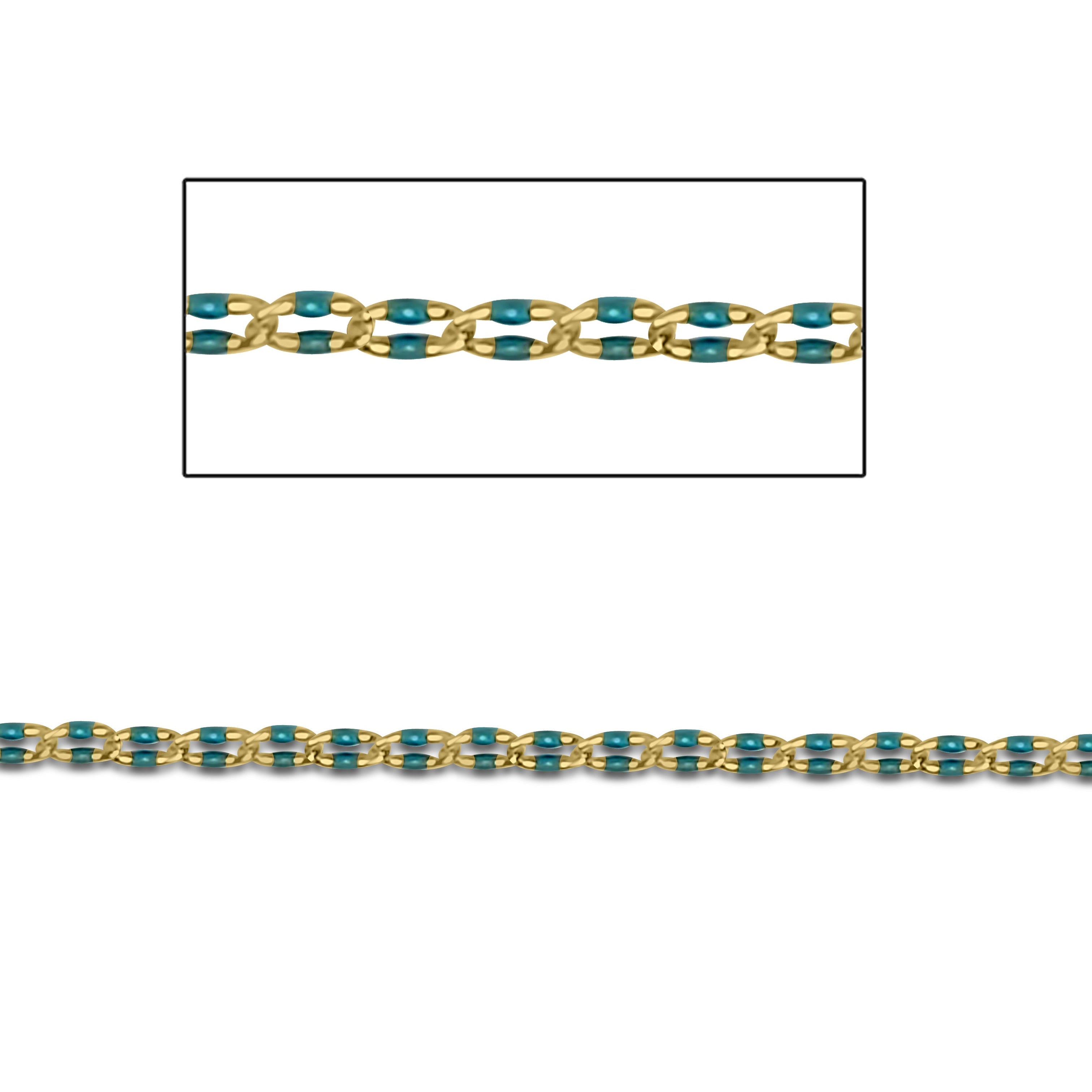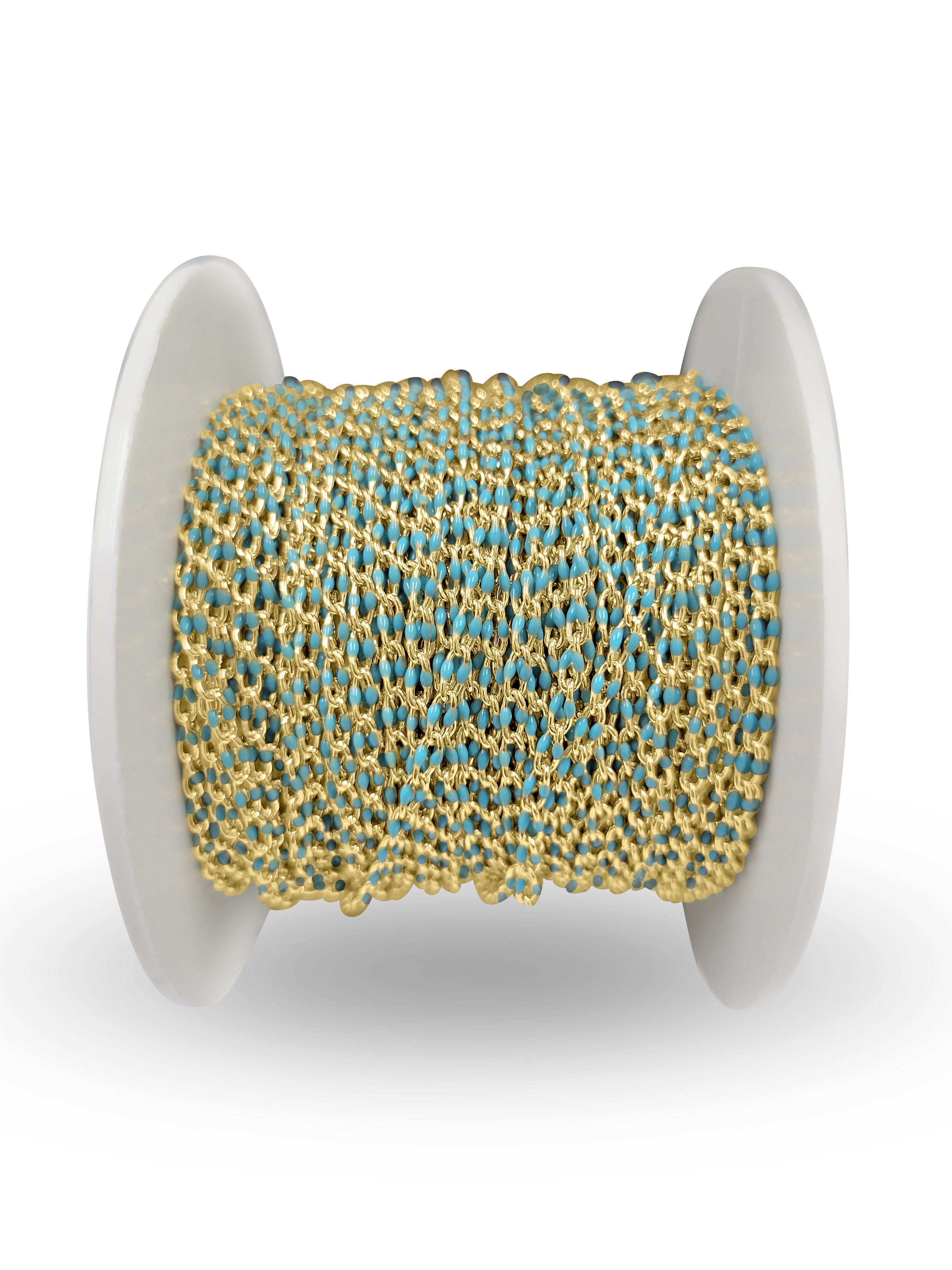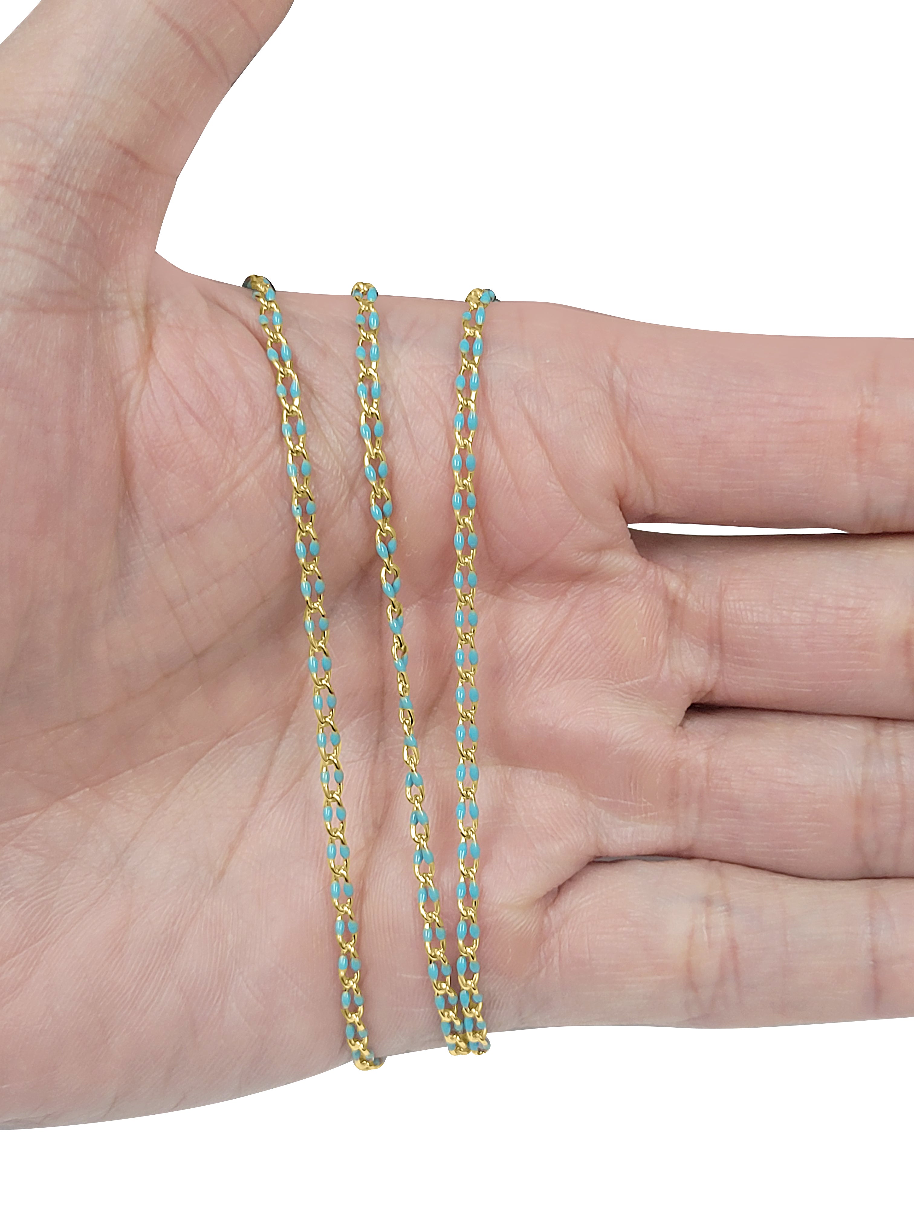 Permanently Turquoise Enameled Cable Chain. Machine run and Soldered Links. Made from 22 gauge wire. Unique chain that can be manipulated into a variety of jewelry designs.